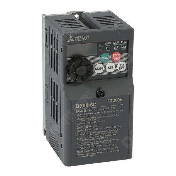 Mitsubishi FR-E700 Series AC Frequency Inverter for 0.1kW (1/8HP) 3 Phase motor in VxF or Sensorless Vector control to 0.8A. Simple set-up and converts single phase 230V input to three phase 230V for a standard AC Induction motor.