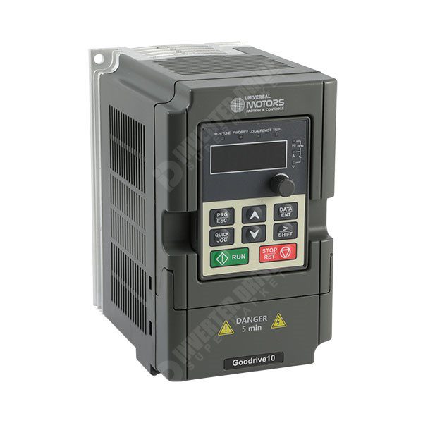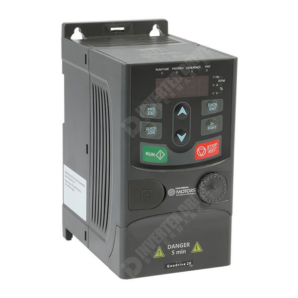 Universal GD20 series AC Inverter for 0.37kW 230V 3ph motor to 2.5A. Operates in standard V/F or Sensorless Vector Control and Converts fixed frequency 230V single phase input to variable frequency 230V three phase to control the speed of a standard AC Induction motor.