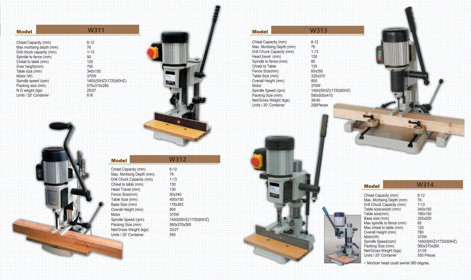 Morticer machines – Các loại máy đục gỗ, máy xọc gỗ, máy xẻ rãnh gỗ W311 W312 W313 W314
