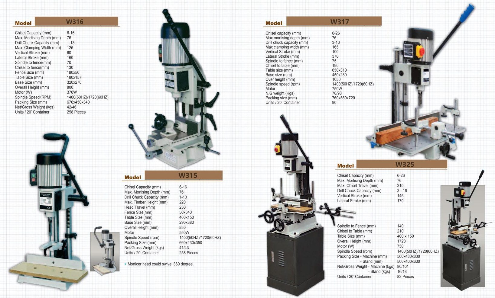 Morticer machines – Các loại máy đục gỗ, máy xọc gỗ, máy xẻ rãnh gỗ W315 W316 W317 W325
